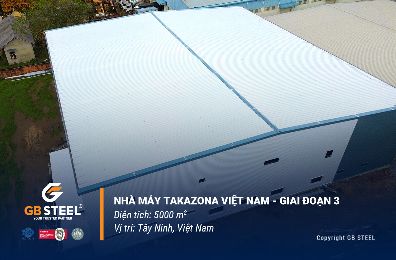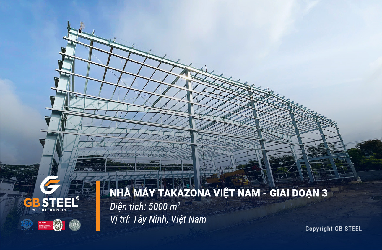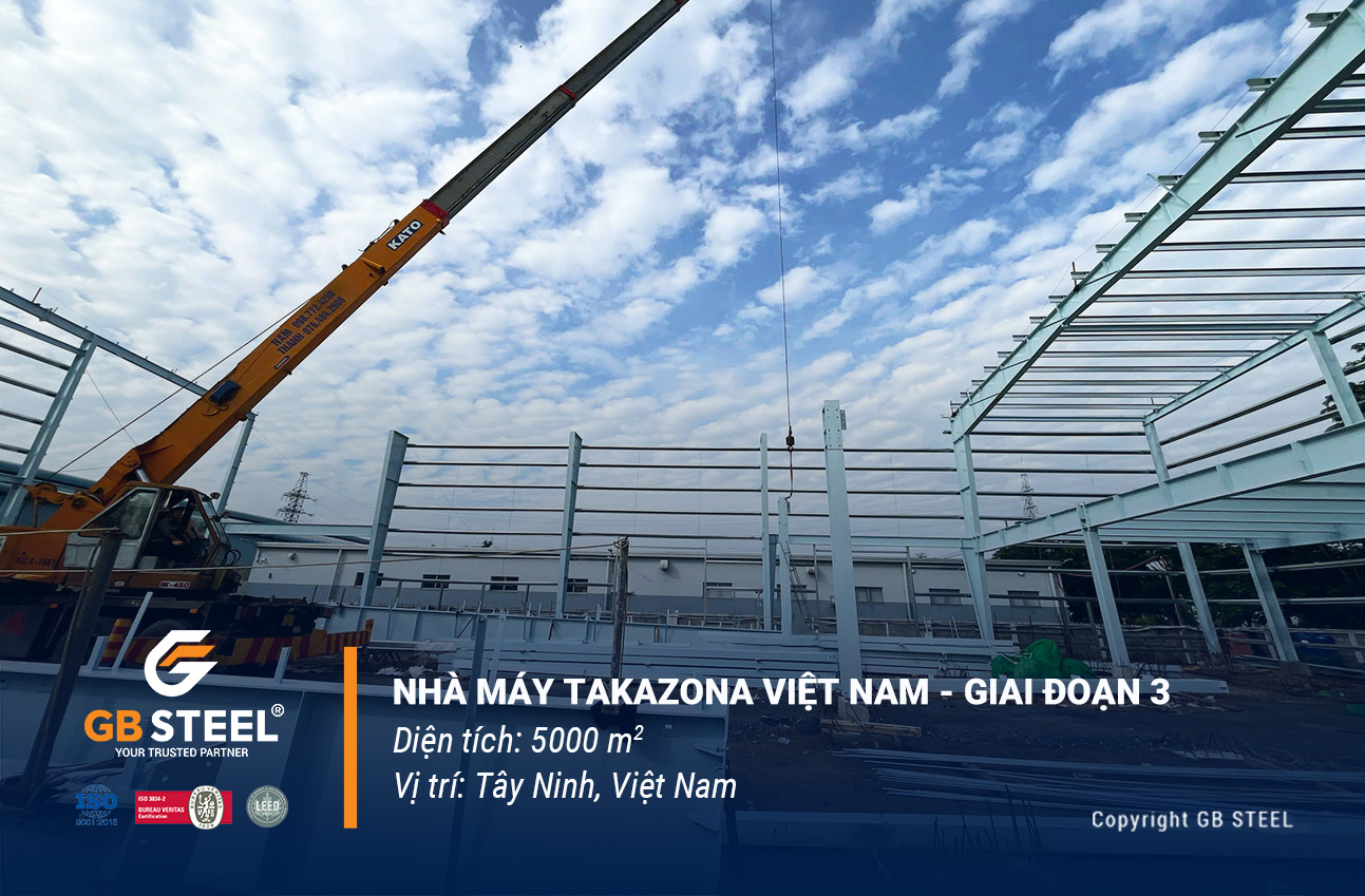 The Takazona Vietnam Factory – Phase 3 project is located in Long Hau's Industrial Parks, Tay Ninh Province, covering a total area of 5,000 m²The project features an optimized structural design, enhancing both construction efficiency and space utilization. GB STEEL is responsible for the fabrication and erection of the steel structure, ensuring strict adherence to quality, safety, and project timeline.
